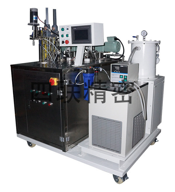 一、概述 二、主要技術(shù)規(guī)格及精度 1.控制方式:機(jī)械手,自動(dòng)配比,自動(dòng)定量澆注; 2.澆注方式:在常壓條件下進(jìn)行澆注,可設(shè)置多個(gè)注膠程序,澆注量可微調(diào)修正; 3.膠液吐出量范圍:0.6g~25g /shot; 4.膠液調(diào)配比率范圍:100:20~100:120; 5.最小吐膠量:0.6g; 6.計(jì)量誤差: ±2%; 7. 吐膠速度: 0.6 g /s; 8. 吐膠方式:連續(xù)、單次; 9. 吐膠控制:腳踏及手動(dòng)/自動(dòng)控制; 10. 膠液混合要求:動(dòng)態(tài)攪拌混合,注膠頭可更換,混合腔易拆卸,便于清理; 11. 混合前A、B料可單獨(dú)吐料抽檢; 12.設(shè)備操作: 觸摸屏和PLC控制; 13. 驅(qū)動(dòng)方式:伺服電機(jī)驅(qū)動(dòng); 14. 殘存膠液清洗系統(tǒng):清洗液沖洗系統(tǒng); 15.膠液攪拌速度:變頻器控制,速度可調(diào),100~3000r/min; 16. 加熱系統(tǒng):溫度 0℃~50℃可控 17. 冷卻系統(tǒng) :溫度 5℃~10℃可控 18. 真空系統(tǒng):膠液抽真空:1.1torr(mmHg) 19. 自動(dòng)防固化系統(tǒng),防固化時(shí)間可自由設(shè)定; 20. 耗電量 :AC220V/2KW 21. 氣源 :0.3~0.8Mpa 22. 工作環(huán)境:電源220V±5%,50±1HZ 三相交流,溫度 15℃~35℃ ,相對(duì)濕度<80%。 三、系統(tǒng)配置 1.系統(tǒng)配置 1.1 不銹鋼制密閉式10L(雙層)主劑原料桶 (配有空氣干燥裝置),一套 1.2 不銹鋼制密閉式10L(雙層)固化劑原料桶(配有空氣干燥裝置) ,一套 1.3 主劑、固化劑液位觀察裝置 ,二套 1.4 主劑SIC耐磨齒輪泵計(jì)量系統(tǒng) , 一套 1.5 固化劑SIC耐磨齒輪泵計(jì)量系統(tǒng), 一套 1.6 伺服(或變頻)驅(qū)動(dòng)裝置 ,一套 1.7 泵部前端單向逆止閥 , 二套 1.8 主劑固化劑泵部OUT管(耐腐蝕),二套 1.9 動(dòng)態(tài)混料器, 一套 1.9.1 電器控制系統(tǒng), 一套 1.9.2 人機(jī)見面觸摸屏,一套 1.9.3 壓縮空氣系統(tǒng) ,一套 1.9.4 控制與測量裝置 , 一套 1.9.5 清洗裝置 ,廢液環(huán);厥昭b置, 各一套